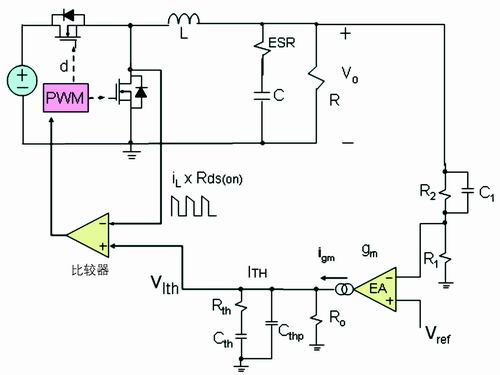 通過前面的討論可知,在每個開關周期,低端的開關管流過的電流波形為下降階段的梯形波。這種電流模式常稱為谷點電流模式。和峰值電流模式一樣,谷點電流模式反饋也有兩個環路:一個電壓外環,另一個是電流內環(見圖2)。