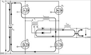 兩個互為對角的全橋開關不是同時驅動,而是通過相移的方法在啟動命令之間引入預定義的短期延遲。這種延遲由控制電路的電壓回路進行調節,從而在兩個驅動信號之間產生相移。這種相移技術的特殊之處在于,它可啟動兩個與變壓器串聯的開關,而變壓器的電壓卻為零。