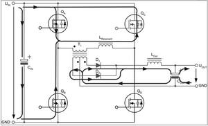 與傳統的全橋轉換器一樣,互為對角的開關一起驅動,對角開關交替地將變壓器原邊置于輸入電壓VIN上一段時間。只有在開關打開時才向輸出部分供電,這與工作在固定頻率上的特定占空比相一致。