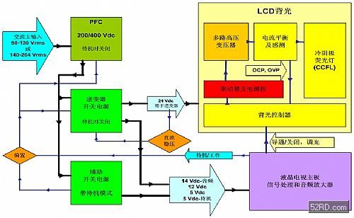 圖1:采用標準直流24V逆變器的傳統液晶電視開關電源框圖。