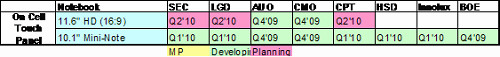 隨著Windows 7推出與對未來市場影響力,2010年多數面板廠商針對Notebook PC市場積極開發具觸控功能11.6寸寬螢幕面板,同時每一家生產迷你筆電面板廠商也都開發具有觸控功能面板。從下表一可以清楚了解每一廠商開發具觸控功能Notebook PC或迷你筆電面板時間表。