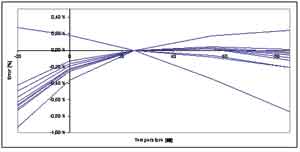 為了在各種溫度變化下獲得更好的性能,愛特梅爾增加了一個額外的基準電壓校準機制,用以調節帶隙基準源的溫度系數。這個校準步驟將調節曲率的形狀和位置,并顯著改善隨溫度變化的穩定性,如圖4所示,在-20~+85℃溫度范圍內的最大變化是0.5%。注意第二個校準步驟可以檢測和顯示出具有截然不同的曲線形狀的離群點。