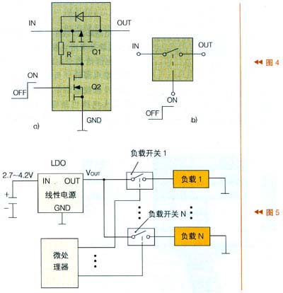 負載管理也可以由微處理器與多個負載開關組成。負載開關是一種功率電子開關,其基本工作原理如圖4-a)所示,它由兩個MOSFET(Q1:P-MOSFET及Q2:N-MOSFET)及一個電阻R組成。其工作原理是:在ON/OFF端加高電平時,Q2導通;Q2導通時將Q1的柵極拉到接近地電平,若其IN接電源電壓VIN,則Q1的源極與柵極之間的-VGS≈VIN,則Q1相繼導通,電源電壓可經(jīng)過負載開關給負載供電;若在ON/OFF端加低電平,則Q2截止;Q1的柵極及源極由電阻R連接,使柵極與源極同電位,即-VGS=0V,Q1截止,電源被切斷,負載失電。負載開關的等效電路如4-b)所示。