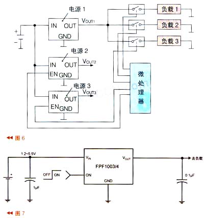 在實際應用中,往往由于電路復雜而采用電源管理IC及多個負載開關組成的負載管理系統(tǒng),如圖6所示。圖6中有3個電源,輸出不同的電壓。電源1給負載1~3供電。為了控制負載1~3的通電或失電,在電源與負載之間設了3個負載開關。電源2、電源3則由電源管理IC來控制其負載的通電或失電。