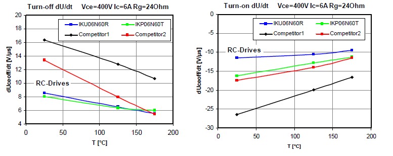 EMI也是大家非常頭痛的一個問題,也是非常關心的一個問題。逆向導通型IGBT同時優化了它的EMI的性能,它有一個非常好的開關,非常平滑的一個開關特性,不會有一個很大的振動,干擾。所以我們可以看到它的關斷和開通的時候dV/dt的現象,基本上在關斷的時候dV/dt基本上控制在一個10V/us的情況,而在開通的時候基本上也可以控制在—10V/us。