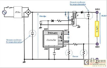創意電子新近推出的TK5401就是這樣一款LED驅動電源IC,它具有不需要DC電源特性中所必須的電解電容的特性,使得LED壽命高達4萬小時以上。據介紹,TK5401封裝內置了高電壓功率MOS管及控制電路,因去除電解電容實現了小型化、低成本,并且實現了LED燈的長壽命和高效能。