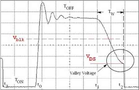 在這一條件下,得到的二次電壓不足以使電壓VDS為零,只是得到了電壓谷值。圖2顯示了準諧振反激式變換器的典型VVS工作模式。若符合方程1的條件,則谷值電壓將為零,從而獲得ZVS。