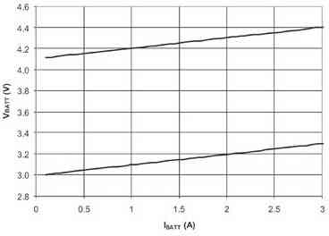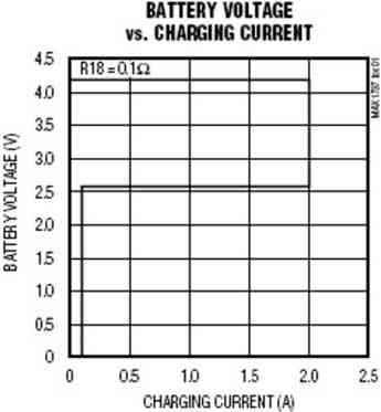 圖1為用于鋰離子電池充電器的CC-CV集成電路(MAX1737)的V-I特性曲線。這種類型的IC是消費類產品中所有鋰離子電池充電器的核心。圖中可清楚看出CC(2.6V至4.2V電池電壓)和CV(4.2V)區域。