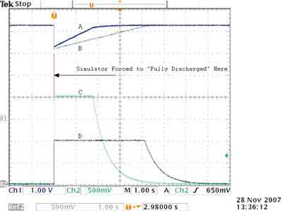 圖3根據圖2電池仿真電路繪制出的圖形,快速充電波形表明兩種條件下電池充電器的工作情況,分別是:CC階段提供1A(曲線B和D)和2A(曲線A和C)充電電流