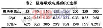模塊過壓保護(hù)一般也可采用阻容吸收法。對于持續(xù)時間較短,能量不大的過電壓,一般可在模塊兩端并聯(lián)阻容吸收電路,用吸收電容把過電壓的電磁能量變成靜電能量存貯起來。而用吸收電阻不但可以防止電路振蕩,還可限制晶閘管導(dǎo)通時電容放電所產(chǎn)生的開通損耗和di/dt值。并聯(lián)在晶閘管開關(guān)模塊的RC值可參考表2。