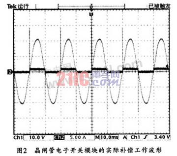 在無功補償實際應(yīng)用中,可將晶閘管電子開關(guān)模塊用在TSC低壓無功補償以替代接觸器,這樣,就可以在開關(guān)電壓過零時投入補償電容量,從而避免了沖擊電流的產(chǎn)生和瞬間電網(wǎng)電壓的波動。圖2所示是其工作波形圖。