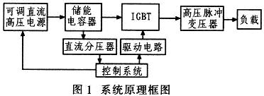 系統(tǒng)工作過程如下:由控制系統(tǒng)控制可調(diào)直流高壓電源給儲能電容器充電,當(dāng)充電電壓達到設(shè)定值后,再控制IGBT按照設(shè)定的頻率和脈沖寬度導(dǎo)通,產(chǎn)生脈沖電壓加在高壓脈沖變壓器原邊,最后由高壓脈沖變壓器升壓,產(chǎn)生所需的高壓脈沖加在負(fù)載上。