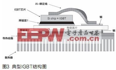 圖3顯示了帶基板的功率模塊的結構。兩側都帶薄銅層的陶瓷襯底被焊接在基板上。IGBT芯片被焊在設計好的銅層上。芯片的表面通過綁定線(bondingwire)壓焊到銅層上。大多數標準模塊采用這種制作方法。目前70%到80%的功率模塊都按照標準模塊結構來制造。陶瓷一般采用Al2O3,基板采用銅為材料。IGBT底板通過導熱硅脂安裝散熱器。