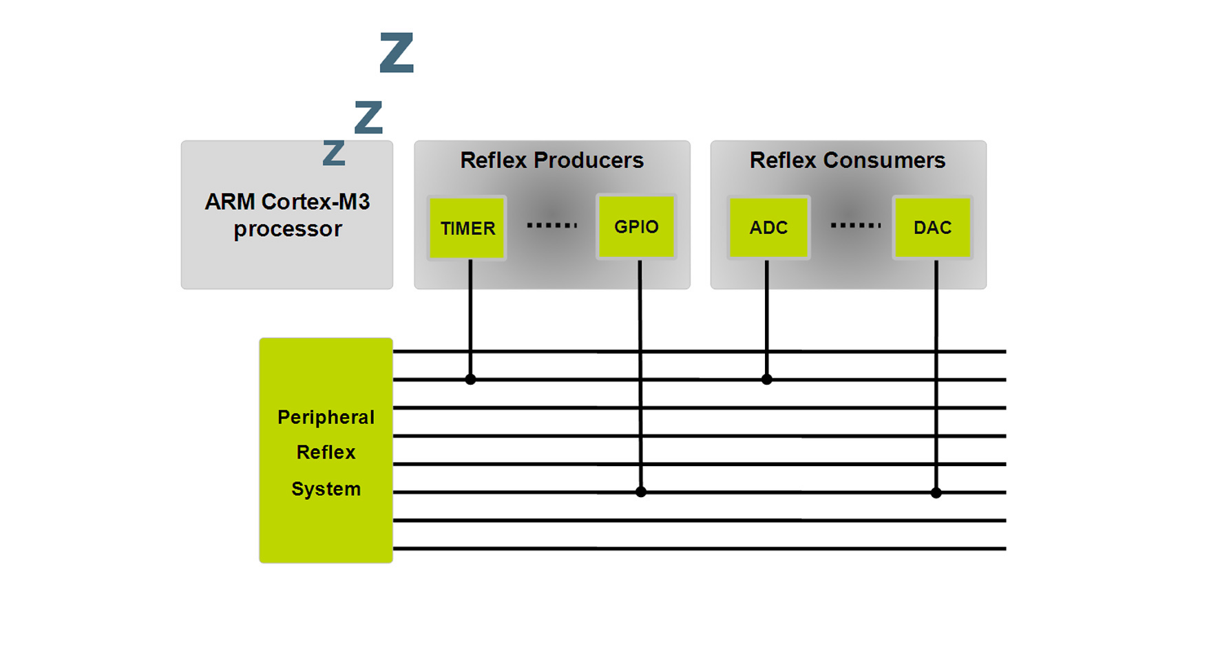 圖4使用一個互連矩陣或外圍設備反射系統可以執行簡單的任務如開始數據轉換和存儲結果,完全無需喚醒32位處理器內核。