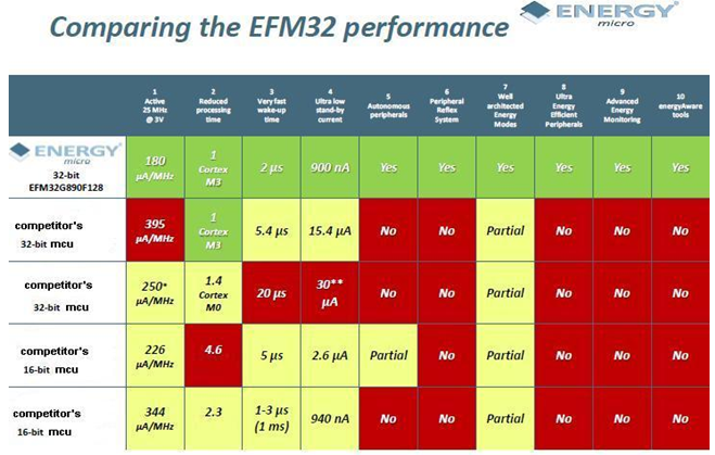 圍繞節(jié)能的ARM ® Cortex™- M3處理器架構(gòu),Giant Gecko, Gecko 和Tiny Gecko微控制器的使用證明它們可比8 - ,16 - 或32位微控制器節(jié)能四分之一。 這些微控制器具有僅為2μs的喚醒時(shí)間和MHz執(zhí)行代碼下每閃存 180μA的電流消耗,深度睡眠模式下為900nA, 關(guān)閉模式下為20nA, 這些微控制器被證明有能力延長(zhǎng)300%的標(biāo)準(zhǔn)電池壽命。[page]