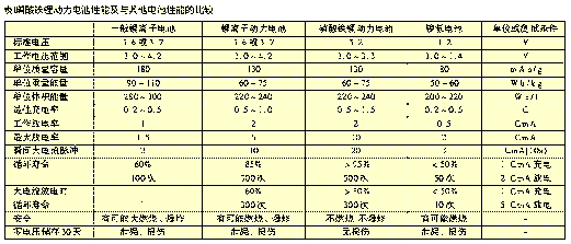磷酸鐵鋰動力電池主要性能列于表1。為了與其他可充電電池的相比較,也在表中列出其他種類可充電電池性能。這里要說明的是,不同工廠生產(chǎn)的磷酸鐵鋰動力電池在各項(xiàng)性能參數(shù)上會有一些差別;另外,有一些電池性能未列入,如電池內(nèi)阻、自放電率、充放電溫度等。