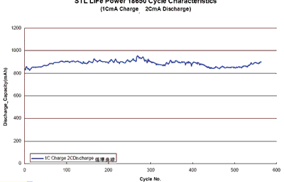 STL18650的充放電循環(huán)壽命曲線如圖4所示。其充放電循環(huán)的條件是:以1C充電率充電,以2C放電率放電,歷經(jīng)570次充放電循環(huán)。從圖4的特性曲線可看出,在經(jīng)過570次充放電循環(huán),其放電容量未變,說明該電池有很高的壽命。
