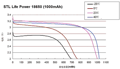 容量為1000mAh的STL18650在不同的溫度條件下(從-20~+40℃)的放電曲線如圖3所示。如果在23℃時放電容量為100%,則在0℃時的放電容量降為78%,而在-20℃時降到65%,在+40℃放電時其放電容量略大于100%。