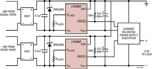 四對PD電路是最大的變化(圖4b)。現在需要采用兩個LTC4257器件,電源電路必須具備足夠的智能,以便把從每一個通道吸取的電流限制在802.3af規范容許的范圍之內。要做到這一點,就要平衡從每一對線吸取的電流或平衡從每一對線吸取的功率,直到它接近(但是不超過)ICUT極限,然后,才從其它線對吸取電流。這種電路可能相當復雜,不同的設計之間差異也很大。