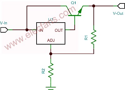 計算過程中輸入電流的使用,使得穩(wěn)壓器靜態(tài)或接地電流均得到考慮。在要求負載電流大于穩(wěn)壓器承受能力的情況下,可以添加一個外部晶體管,如圖4所示。這種做法僅適用于可調輸出穩(wěn)壓器。