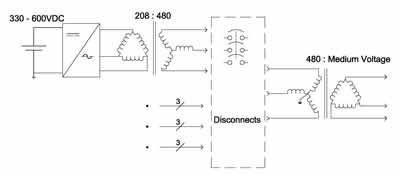 由于體積龐大而且沉重,傳統逆變器會限制光伏逆變器系統的設計。采用2個500千瓦逆變器的系統設計需要在地面上安裝逆變器,因為這種逆變器/變壓器搭配的尺寸和重量較大。即使隔離變壓器可以與逆變器相互分離,由于較低的電壓與較高的電流這種安裝所導致昂貴的導線成本,每一個逆變器所需要的較低的輸出電壓和多繞組也會限制相互分離的距離。