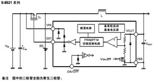 通過外接P溝道功率MOSFET或PNP晶體管、線圈、電容器和二極管,可以構成降壓型DC/DC控制器,該產品適用于移動設備的電源。主要指標:輸入電壓為2.5?16V,輸出電壓為1.5?6.0V,可以0.1V為進階單位來進行設定;低消耗電流工作時:60μA最大值(A、B型產品);休眠時:0.5μA最大值。振蕩頻率典型值為180kHz(A、B型產品);軟啟動功能典型值為8ms(A、B型產品);備有開/關控制功能。圖2為S-8251基本電路。