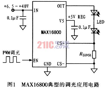 圖1為MAXl6800典型的調光應用電路。MAXl6800具有高輸入電壓范圍(達40V),可直接連接到汽車電池而不需要保護器件,保護器件一般用來抵御電池負載變化帶來的浪涌電壓。MAxl6800能夠為LED提供恒定電流,電流值可以通過與LED串聯的檢流電阻RSENSE設置。為了提高電流設置精度,提高對外部噪聲的抑制能力,MAXl6800采用差分電流檢測輸入方式。