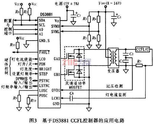 由于基本的CCFL電路中包含有外部晶體管、變壓器和燈管,CCFL架構存在EMI輻射源。圖3給出利用DS388lCCFL控制器構建的CCFL燈管電源電路,該設計優化于汽車應用環境。DS388l利用擴展頻譜和頻率偏移技術大大降低了EMI輻射,并把噪聲頻譜搬移到系統不敏感的頻段,從而克服了EMI輻射。