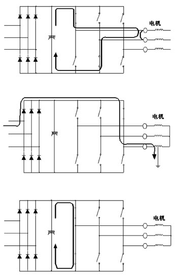 IGBT保護(hù)一般在硬件電路里實(shí)現(xiàn),根據(jù)要保護(hù)的過(guò)流條件的模式,具體電路和過(guò)流感測(cè)器件的類型會(huì)有所不同。其原因在于,在每個(gè)過(guò)流模式中的路徑和電流流動(dòng)是不一樣的。圖3a至3c顯示了每個(gè)過(guò)流條件模式的典型電流流動(dòng),在主要功率電路里的電流流動(dòng)及其路徑取決于過(guò)流的模式。在開(kāi)關(guān)擊穿和線間短路條件下的短路電流總是流向直流總線上的電容器。然而,故障接地電流通常從交流線輸入,通過(guò)正直流總線和高側(cè)IGBT,流向故障發(fā)生的接地點(diǎn)。沒(méi)有電流流過(guò)總線電容器。