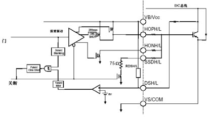 在DSH/L針腳提供主動(dòng)式偏壓結(jié)構(gòu),目的是降低IGBT處于OFF時(shí)流過(guò)二極管寄生電容和內(nèi)部上拉電阻電流的噪聲效應(yīng)。DSH/L給VB/VCC提供相應(yīng)的主動(dòng)式上拉,給VS/COM提供相應(yīng)的下拉。當(dāng)電壓超過(guò)VDESAT臨界電壓的時(shí)候,專用偏壓電路可以降低DSH/L針腳的阻抗。當(dāng)IGBT處于完全開(kāi)啟的時(shí)候,感測(cè)二極管變?yōu)轫樒珼SH/L針腳上的電壓就下降了。這時(shí),偏壓電路不再起作用,目的是降低二極管的偏壓電流。