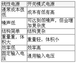 與傳統(tǒng)的線性電源相比,開關(guān)電源具有許多優(yōu)點(diǎn)。在通常情況下,如果只需要一個直流輸出,采用一個變壓器、整流器和濾波電容就可構(gòu)成線性電源。有時,可采用一個線性穩(wěn)壓器提供穩(wěn)壓輸出。這種系統(tǒng)的主要優(yōu)點(diǎn)是簡單,所以成本通常較低。而開關(guān)電源通常結(jié)構(gòu)復(fù)雜、價格昂貴,所以線性電源獲得了廣泛應(yīng)用。表1列出了兩種系統(tǒng)的優(yōu)點(diǎn)和缺點(diǎn)。