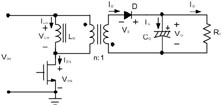 [page]當(dāng)開關(guān)閉合時,電壓施加在變壓器初級的兩端,因?yàn)榇藭r次級二極管是截止的,變壓器所起的作用就像電感器。經(jīng)過初級線圈的電流會上升,同時能量儲存在磁通量中。當(dāng)開關(guān)斷開時,次級二極管導(dǎo)通,電流通過次級時會下降,因?yàn)槟芰勘晦D(zhuǎn)換至次邊大容量電容器。如果電流經(jīng)過磁化電感區(qū)后降至零,這是不連續(xù)導(dǎo)通模式。如果磁化電流未降至零,如圖3所示,則系統(tǒng)以連續(xù)導(dǎo)通模式工作。