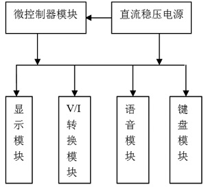 本設(shè)計(jì)采用單片機(jī)作為主要控制部件,通過(guò)鍵盤預(yù)置輸出電流值并采用液晶模塊實(shí)時(shí)顯示。整個(gè)系統(tǒng)硬件部分由微控制器模塊、電壓-電流轉(zhuǎn)換模塊、鍵盤模塊、顯示模塊、直流穩(wěn)壓電源模塊和語(yǔ)音提示模塊組成。系統(tǒng)結(jié)構(gòu)框圖如圖1所示。