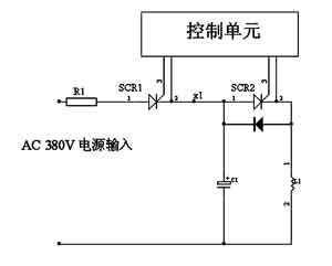 控制原理是:首先通過380V交流電給C1充電,正半周SCR1導通,完成充電過程,負半周SCR1自動截止,C1電壓一直保持到下一個正半周期信號到來。此時開通SCR2,使C1、L1形成回路,產生自由震蕩并完成放電。如此反復循環(huán),即達到了理想的磁場波形。