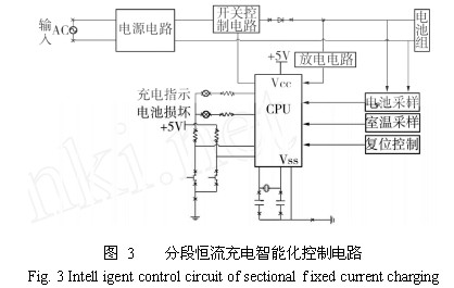 分段恒 流 充 電 智 能 化 控 制 電 路 如 圖3 所示。該電路采用 CPU 控制 ,可對(duì)充電電池和充電環(huán)境溫度進(jìn)行檢測(cè) ,對(duì)電池充電進(jìn)行計(jì)時(shí) ,采樣充電過(guò)程中電池的電壓和電流 ,對(duì)分段恒流充