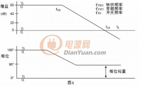 增益帶寬是指單位增益時的頻率,見圖4,增益帶寬就是穿越頻率Fcs。最大穿越頻率的主要限制因素是電源的開關(guān)頻率。根據(jù)采樣定理,如果采樣頻率小于2倍信號頻率(更嚴謹一點的說法是應(yīng)該小于2倍最大信號頻率,譯注),則被采樣的信息就不能被完全讀取。