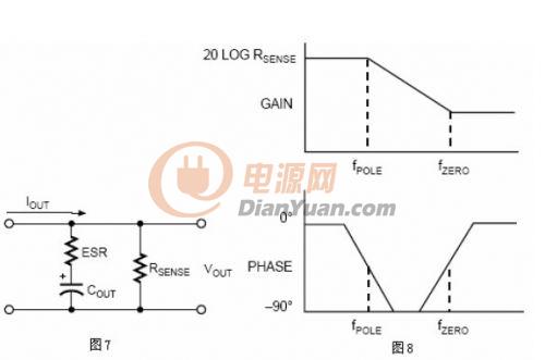 輸出電容的ESR和反饋網(wǎng)絡(luò)的電阻(R1+R2=RFB)反映出輸出濾波器傳輸函數(shù)的特性。圖7的電路分析給出ESR和RSENSE的影響。