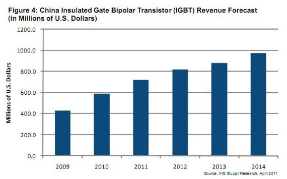 經濟復蘇帶動工業與消費電子的需求增長,以及中國政府推出的經濟刺激政策,不斷推動IGBT銷售額成倍增長。在消費方面,IGBT用于家用電器、相機和手電。IHS公司預測,未來四年消費應用領域的IGBT的復合年度增長率將為15%。