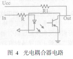 圖4 光電耦合器電路脈沖變壓器的匝數較少,而且一次繞組和二次繞組分別繞于鐵氧體磁心的兩側,它的分布電容很小,僅為幾個皮法,可作為脈沖信號的隔離元件。脈沖變壓器傳遞輸入、輸出脈沖信號時,不傳遞直流分量,因而在微電子技術控制系統中得到了廣泛的應用。