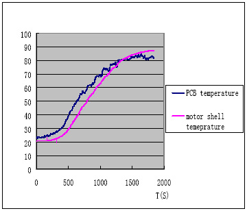 用上文所述的PPTC設計流程可以用在多功能豆漿機馬達防堵保護設計中,但這是往往會碰到選擇PPTC型號困難的問題,也就是說多功能豆漿機的馬達保護設計會較普通的小家電馬達保護復雜的多,圖4為磨制豆漿時PCB板周圍環境溫度和馬達外殼溫度的實測圖,可見控制電路PCB板PPTC周圍的環境溫度最高可以到達85C。由于豆漿機的PPTC最高環境溫度85度會比普通的小家電最高環境溫度要求高,這樣既要在85度的最大工作電流下能正常工作,還要保證在最低溫度0度的堵轉電流情況下能及時的保護,相應的就增大了設計難度。下面就具體的闡述此類多功能豆漿機馬達堵轉的保護設計方案。