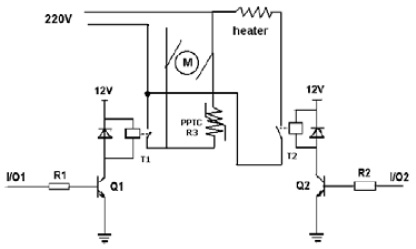 下圖3為多功能豆漿機馬達和加熱器的簡單電路示意圖。豆漿機所用馬達為220V直流馬達,繼電器的工作電壓為12V,豆漿機利用繼電器把MCU發出的低壓控制信號I/O來控制交流高壓信號的通斷,R3為PPTC可恢復電阻,T1和T2為繼電器。