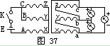 測(cè)單相變壓器時(shí),如圖36所示,在初級(jí)線圈一側(cè)拉入一個(gè)1.5伏的干電池,然后在次級(jí)線圈拉入一直流毫伏表。當(dāng)合上開關(guān)K的一瞬間,表針朝正方向擺動(dòng)(或拉開開關(guān)時(shí)表針向負(fù)方向擺),說明接電池正極一端是同極性,或叫同名端。測(cè)試三相變壓器的極性和級(jí)別,多采用直流法進(jìn)行。測(cè)試方法為:在初級(jí)線圈側(cè)接上干電池和開關(guān)K,先在A端接電池正極,B端接電池負(fù)極,再在次級(jí)線圈a、b、c之間拉入三個(gè)毫伏表,如圖37所示,