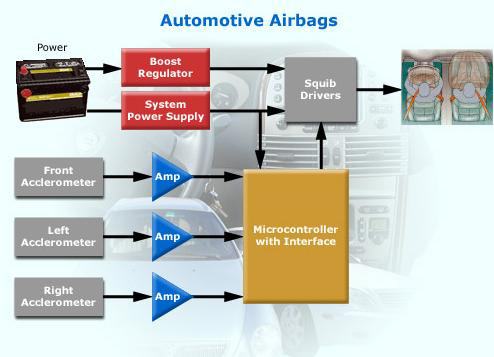 即使是小型的汽車目前都設有6個氣囊,而且所采用的安全標準要求極高。負責為氣囊充氣的是一款稱為爆管驅動器(squib driver)的特別芯片,該芯片必須能夠在撞車的緊急關頭立即啟動。按照圖1所示,氣囊系統由多個部分組成。