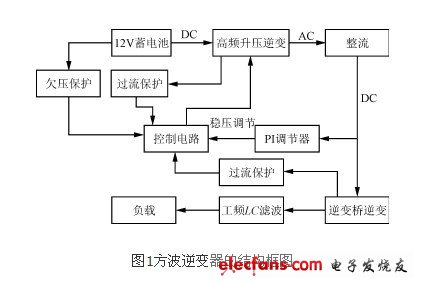 目前,構(gòu)成DC/AC逆變的新技術(shù)很多,但是考慮到具體的使用條件和成本以及可靠性,本電源仍然采用典型的二級變換,即DC/DC變換和DC/AC逆變。首先由DC/DC變換將DC 12V電壓逆變?yōu)楦哳l方波,經(jīng)高頻升壓變壓器升壓,再整流濾波得到一個穩(wěn)定的約320V直流電壓;然后再由DC/AC變換以方波逆變的方式,將穩(wěn)定的直流電壓逆變成有效值稍大于220V的方波電壓;再經(jīng)LC工頻濾波得到有效值為220V的50Hz交流電壓,以驅(qū)動負載。