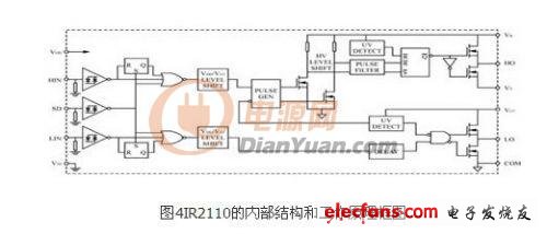 IR2110 的內(nèi)部結(jié)構(gòu)和工作原理框圖如圖4所示。圖中HIN和LIN為逆變橋中同一橋臂上下兩個功率MOS的驅(qū)動脈沖信號輸入端。SD為保護信號輸入端,當該腳接高電平時,IR2110的輸出信號全被封鎖,其對應的輸出端恒為低電平;而當該腳接低電平時,IR2110的輸出信號跟隨HIN和LIN而變化,在實際電路里,該端接用戶的保護電路的輸出。HO和LO是兩路驅(qū)動信號輸出端,驅(qū)動同一橋臂的 MOSFET。
