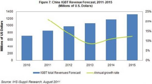 據IHS iSuppli公司中國研究服務即將發表的一份報告,由于綠色能源與能源效率得到更多的重視,以及政府投資支持和嚴格的能源政策,2011-2015年中國絕緣柵雙極型晶體管(IGBT)市場銷售額的復合年度增長率將達13%。
