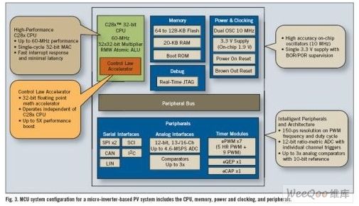 圖3 面向基于微逆變器PV的系統的MCU系統包含CPU、存儲器、電源及時鐘、外設