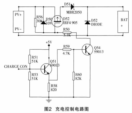 單片機(jī)(P2.0)給出充電的控制信號(hào),即P2.0=1,NPN 型S9013 的三極管導(dǎo)通,由于此三極管工作于射極輸出狀態(tài), 其發(fā)射極為高電平,Q54 (2SD667)NPN 三極管導(dǎo)通, 由于穩(wěn)壓管D50的作用, 使得IRF4905管的柵源電壓鉗位在-10V,IRF4905 管導(dǎo)通, 太陽電池向蓄電池充電。反之,前兩極三極管均截止VGS=0V,IRF4905 管斷開,太陽電池不能向蓄電池充電。