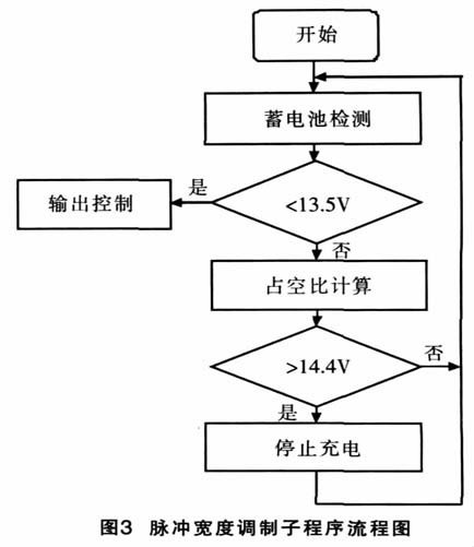脈寬調(diào)制子程序完成太陽電池向蓄電池以脈寬調(diào)制的方式充電,控制器根據(jù)蓄電池的荷電狀態(tài)來控制白天太陽電池向蓄電池充電,其目的是為了改善充電效果和保護(hù)蓄電池,防止蓄電池過充。
