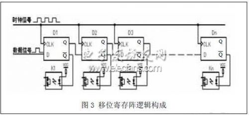 移位寄存陣是由D 觸發器串聯構成的,它與光電繼電器一起構成選通電路。圖3 中,D1,D2,……Dn 表示的是D 觸發器,每個D 觸發器的輸出Q 是下一個D 觸發器的數據信號,所有的D 觸發器由相同的時鐘信號控制。D 觸發器的反碼輸出Q 用來控制對應的光電繼電器的通斷,當Q 為高電平時光電繼電器斷開,當Q 為低電平時光電繼電器導通。通過控制第一個D 觸發器的數據信號,可實現D1,D2,……Dn 的Q 逐個輸出低電平即移位功能,從而控制光電繼電器K1,K2,……Kn按順序的逐個單獨閉合,實現通道選通功能。